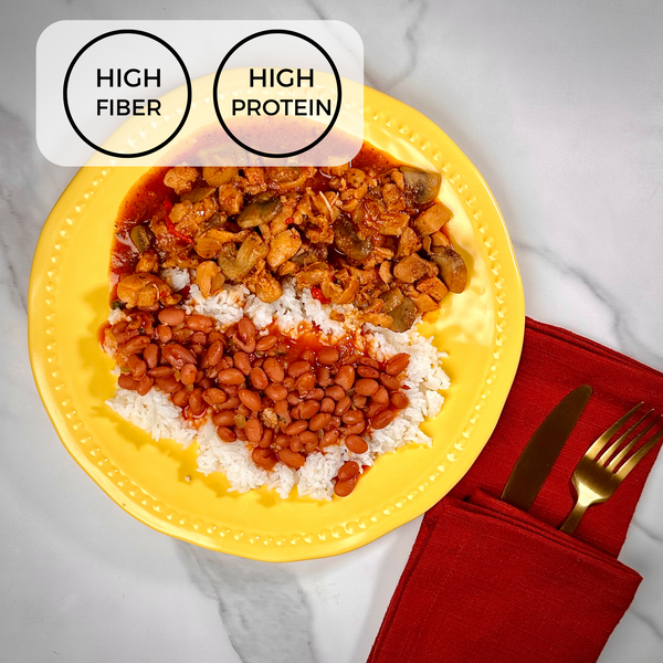 Dominican chicken thigh stew with sauted mushrooms, jasmin white rice and red beans.