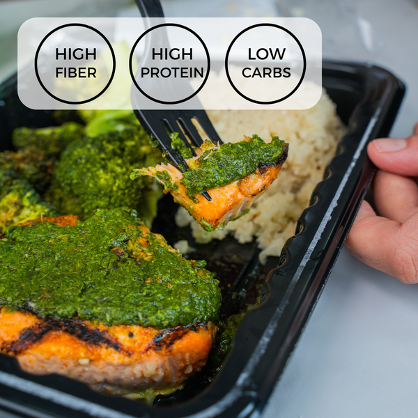 Low carb and keto friendly grilled salmon with cauliflower rice and broccoli, served with home made green goddess sauce.