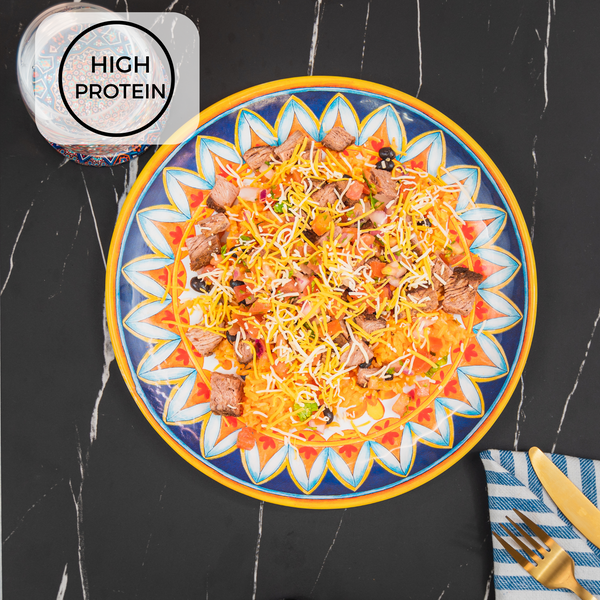 Steak, Mexican rice, black beans, pico de gallo, low-fat mixed cheese.
