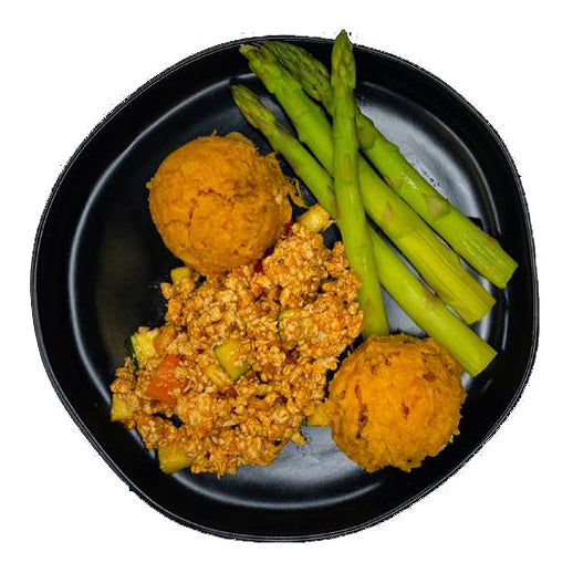 Lean ground chicken, carrots, zucchini, roasted asparagus & mashed sweet potato.