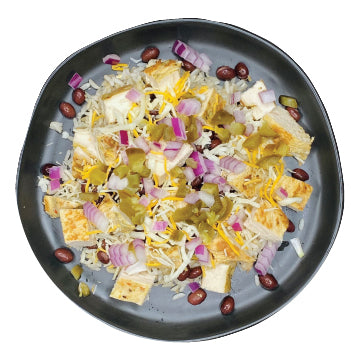 Grilled Chicken, Mexican rice, black beans, low-fat mixed cheese, jalepeño & red onion.