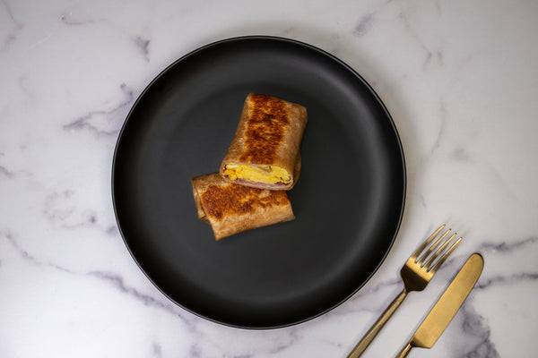 Scrambled eggs, low-fat turkey bacon, cheddar cheese on a whole wheat wrap.